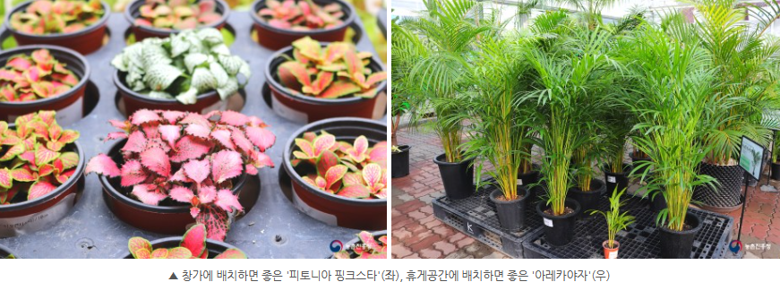 빛이 잘 드는 창가에 큰잎극락조화, 칼라데아,피토니아 핑크스타를 배치하면 좋습니다. 휴게공간에는 정신적 스트레스를 해소하는 데 도움이 되는 공기정화식물을 놓으면 제격입니다. 아레카야자, 드라세나 자바, 산호수 등이 적합하다고 합니다.