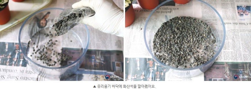 1. 원형 유리용기에 바닥에 숯이나 화산석 화산석처럼 입자가 굵은 배지를 깔아 배수층을 만들어줍니다.