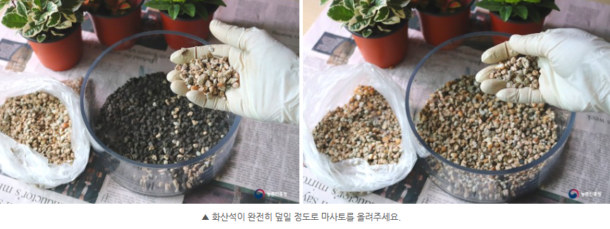 2. 화산석이 완전히 덮일 정도로 마사토를 깔아 배수층을 조금 더 높게 만들어줍니다.