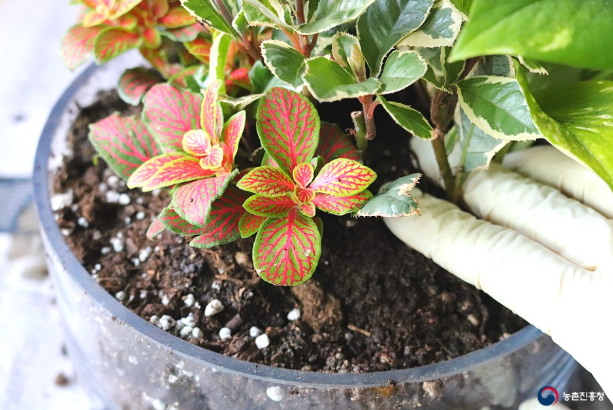 6. 식물 주변을 배양토로 채우고 손으로 꾹꾹 눌러가며 고정해 줍니다.