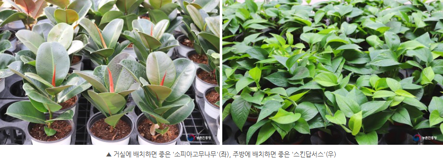 거실 및 베란다에는 공기 정화 기능과 휘발성 유해물질 제거 능력이 뛰어난 1m 이상의 식물인 소피아고무나무, 시클라멘, 팔손이나무를 배치하면 좋다고 합니다.