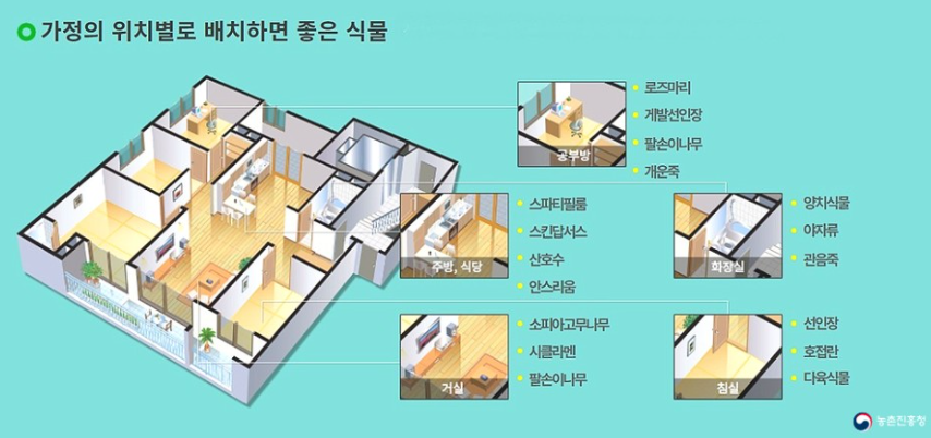 보통 아이들 공부방, 주방, 거실, 침실, 화장실 등으로 공간이 세분화되어 있을 것입니다. 각 식물의 특성에 맞게 배치하면 보다 효과적으로 미세먼지를 제거하고 공기 정화할 수 있습니다.