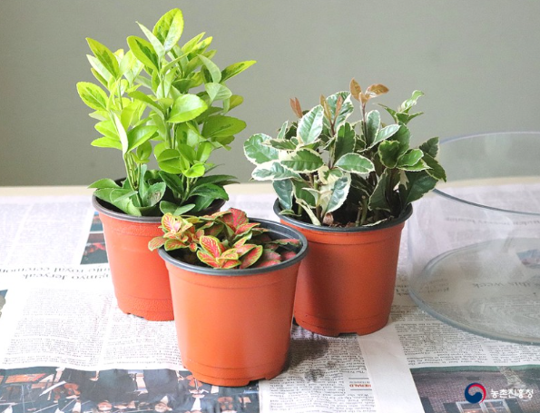 유리 용기 크기와 직사광이 어려운 실내 환경을 고려해 키가 너무 크지 않으면서도 반음지에서도 잘 자라는 황금사철나무, 피토니아 오렌지스타, 무늬 산호수, 스킨답서를 준비했습니다.