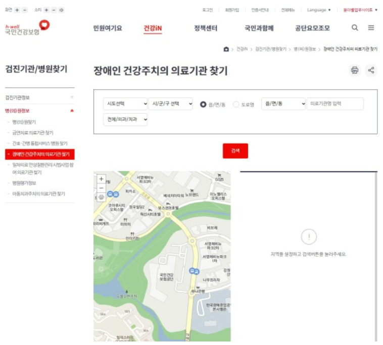 · 국민건강보험공단 홈페이지▶건강 iN▶검진기관/병원 찾기▶병(의) 원정보▶장애인 건강주치의 의료기관 찾기