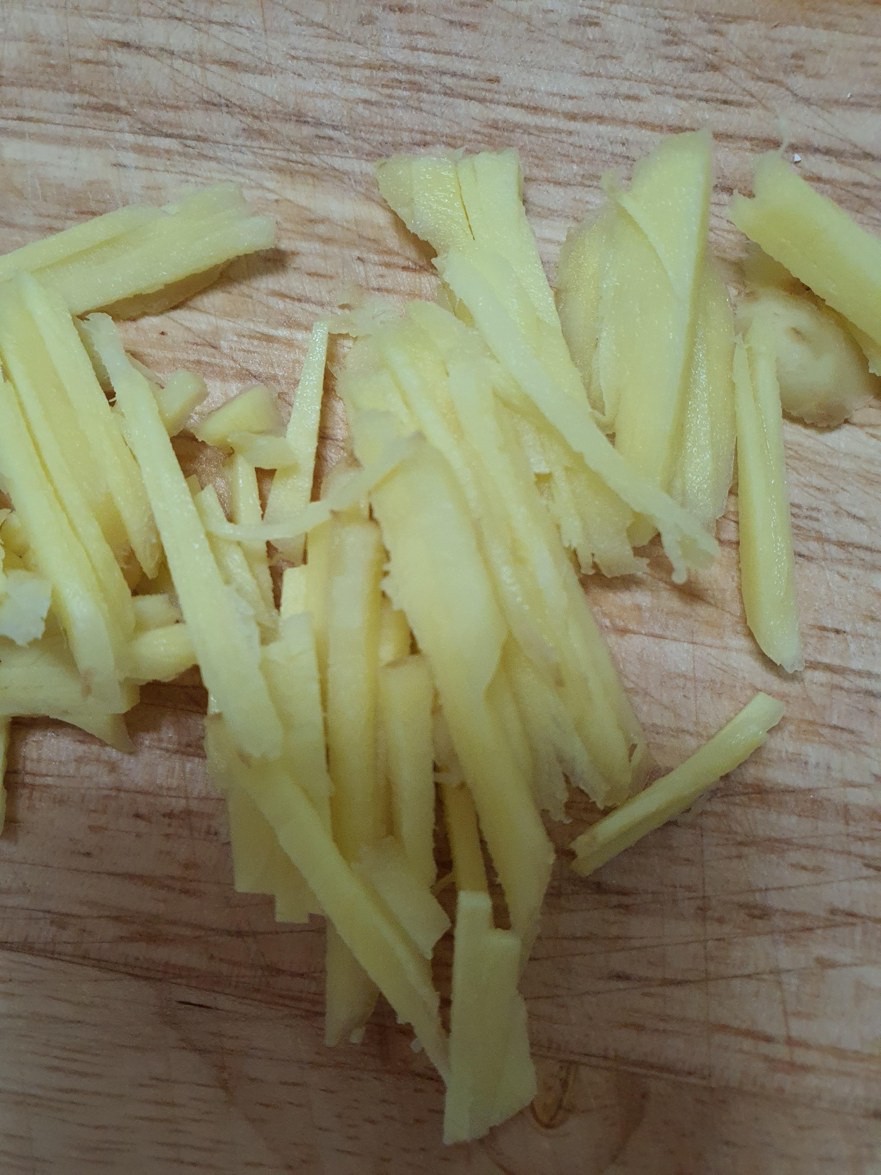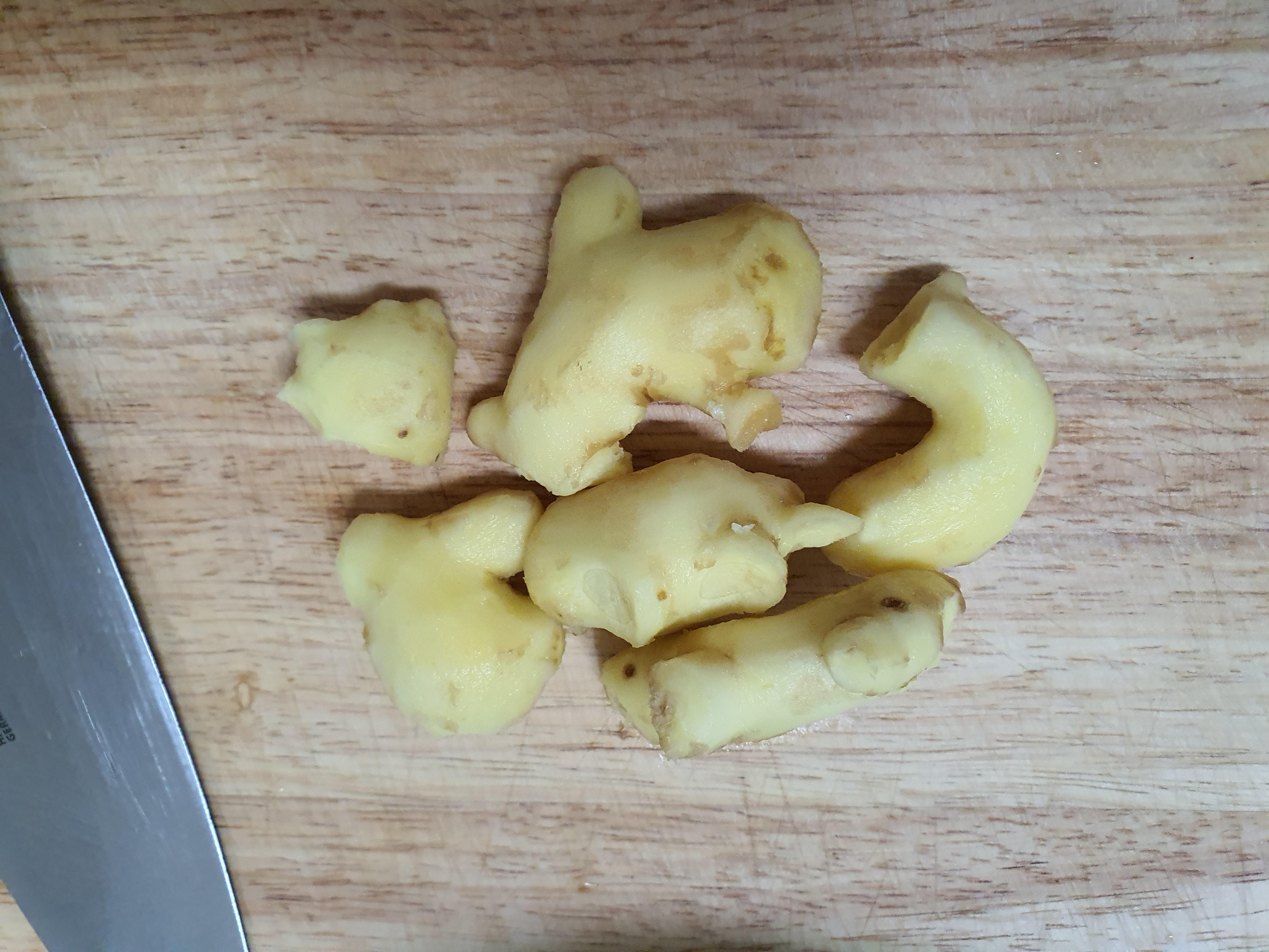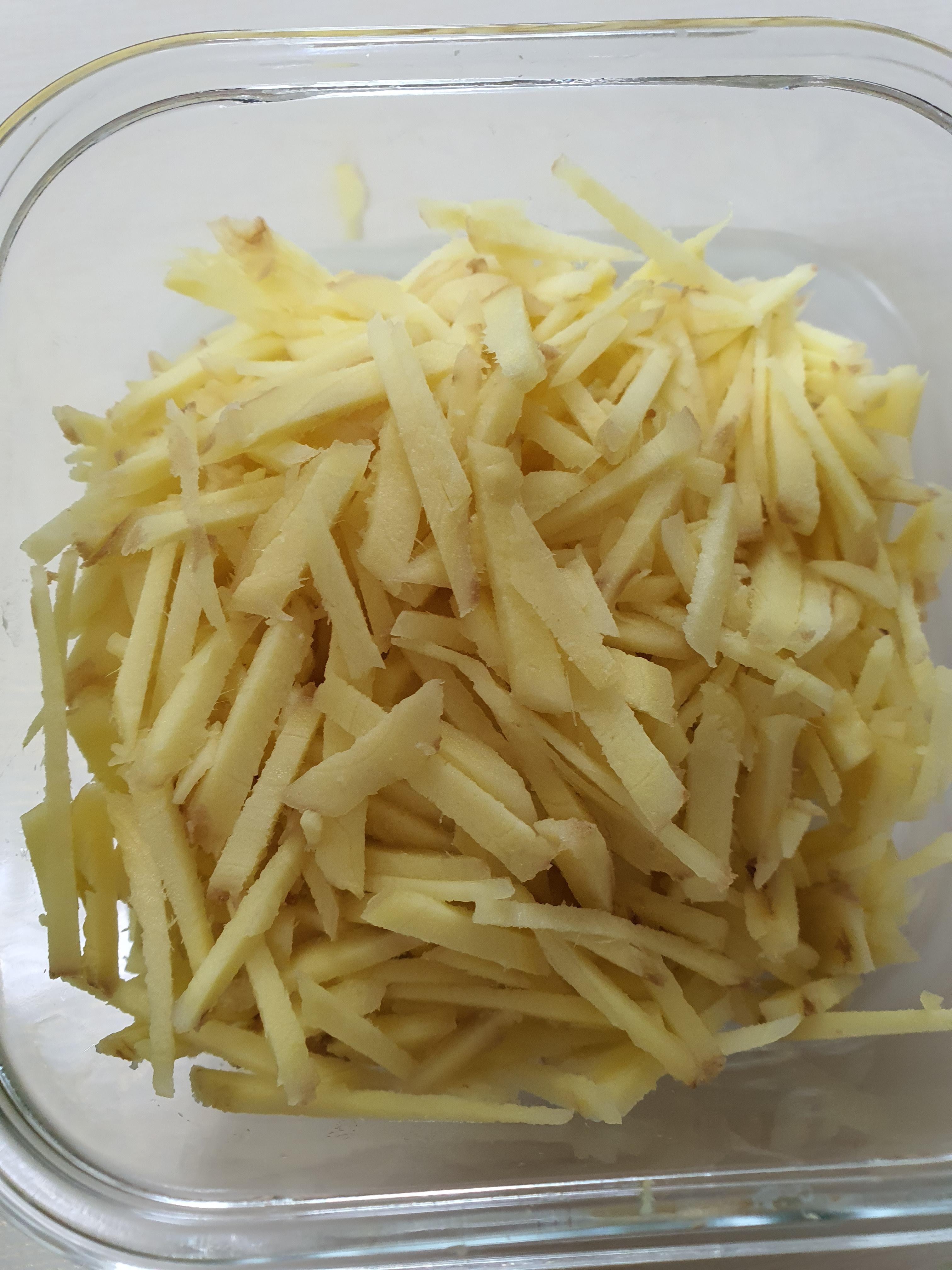 생강의 껍질을 벗기고 칼로 채로 썰어 줍니다.
