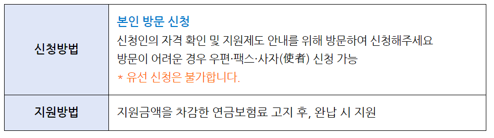 지원 신청은 가까운 국민연금공단 지사에 직접 방문하세요!