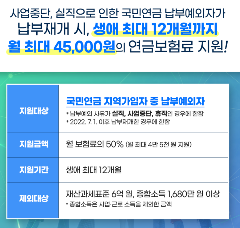 사업중단, 실직으로 인한 국민연금 납부예외자가 납부재개 시, 생애 최대 12개월까지 월 최대 45,000원의 연금보험료를 지원합니다.