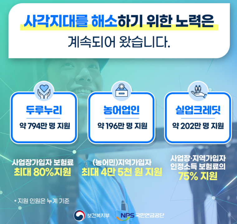 국민연금의 사각지대 해소 노력은 계속되어왔는데, 이한 노력으로 납부예외자가 매년 꾸준히 감소해왔다고 합니다. 하지만, 여전히 연금 사각지대에 노출되어 있는 지역가입자를 위해 2022년 7월 1일부터 국민연금 지역가입자 연금보험료지원을 시작한다고 합니다.