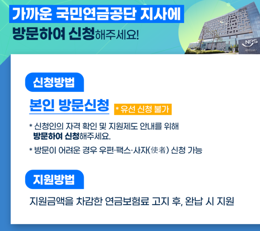 지원 신청은 가까운 국민연금공단 지사에 직접 방문하세요!