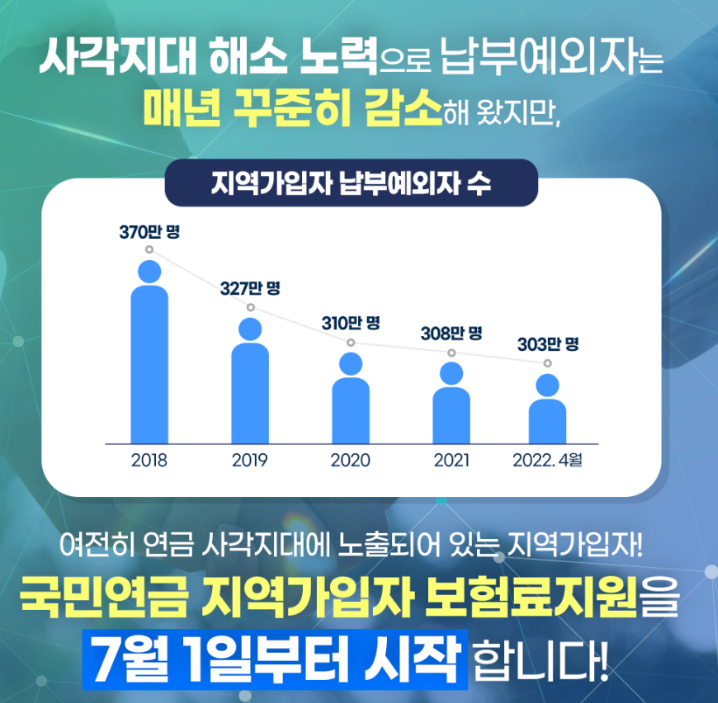 국민연금의 사각지대 해소 노력은 계속되어왔는데, 이한 노력으로 납부예외자가 매년 꾸준히 감소해왔다고 합니다. 하지만, 여전히 연금 사각지대에 노출되어 있는 지역가입자를 위해 2022년 7월 1일부터 국민연금 지역가입자 연금보험료지원을 시작한다고 합니다.