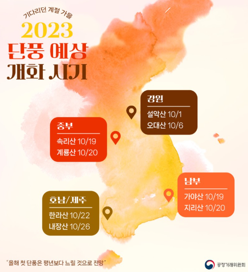 그래서 오늘은 2023 단풍 개화·절정 시기를 소개해 드리겠습니다.