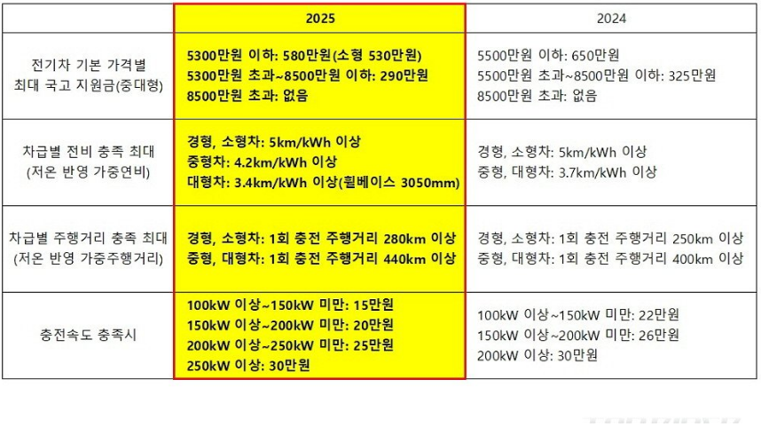 전기차 에너지 소비효율(가중연비)은 차종에 따라 다른 기준이 적용된다고 합니다. 2025년 연비 기준은 초소형과 경소형 5km/kWh 이상, 중형 4.2km/kWh 이상, 대형 3.4km/kWh 이상으로 세분화 됐다고 합니다. 기준 부합 시 개소세 300만 원, 교육세 90만 원, 취득세 140만 원 등 최대 580만 원이 지원된다고 합니다.
