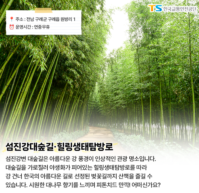 섬진강변 대숲길은 아름다운 강 풍경이 인상적인 관광 명소입니다. 대숲길을 가로질러 야생화가 피어있는 힐링생태탐방로를 따라 강 건너 한국의 아름다운 길로 선정된 벚꽃길까지 산책을 즐길 수 있습니다.