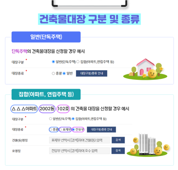 정부24 메인 페이지의 자주 찾는 서비스에서 건축물대장을 선택한 후 원하는 건축물대장의 구분과 종류를 선택하여 정확한 주소지를 입력하면 됩니다.