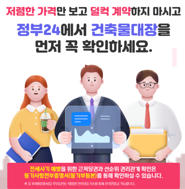 전세계약 시 저렴한 가격만 보고 덜컥 계약하지 않고 정부24에서 건축물대장을 먼저 확인하고 계약하시길 바라봅니다.