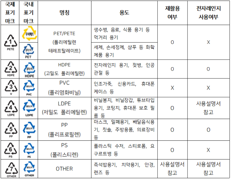 전자레인지용 플라스틱에 대해 알아보기 전, 플라스틱 재활용 마크에 대해 살펴보겠습니다. 국내에서 사용하고 있는 플라스틱 재활용 마크는 국제표준마크와 국내표준마크가 있습니다. 국제표준마크는 삼각형 화살표 안에 1~7번까지 숫자를 표기한 것이고, 국내표준마크는 삼각형 화살표 밑에 재질을 표기해 놓았다고 합니다. 그래서 '숫자'나 '재질'을 학인하면 재활용부터 전자레인지 사용 여부까지 쉽게 알 수 있다고 합니다.