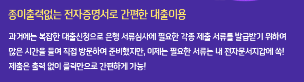 거기다 과거에는 복잡한 대출신청으로 은행 서류심사에 필요한 각종 제출 서류를 발급받기 위해 많은 시간을 들여 직접 방문하여 준비했지민, 이제는 필요한 서류는 내 전자문서지갑에서 출력 없이 클릭만으로도 간편하게 이용 가능하다고 합니다.