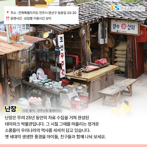 난장은 무려 25년 동안의 자료 수집을 거쳐 완성된 테마파크 박물관입니다. 그 시절 그때를 떠올리는 정겨운 소품들이 우리나라의 역사를 세세히 담고 있습니다. 옛 세대의 생생한 풍경을 아이들, 친구들과 함께 나눠보는 것도 좋을 것 같습니다.