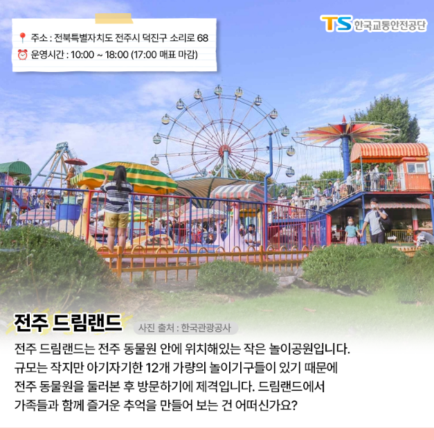 전주 드림랜드는 전주 동물원 안에 위치해있는 작은 놀이공원입니다. 규모는 작지만 아기자기한 12개 가량의 놀이기구들이 있기 때문에 전주 동물원을 둘러본 후 방문하시기에 제격입니다.
