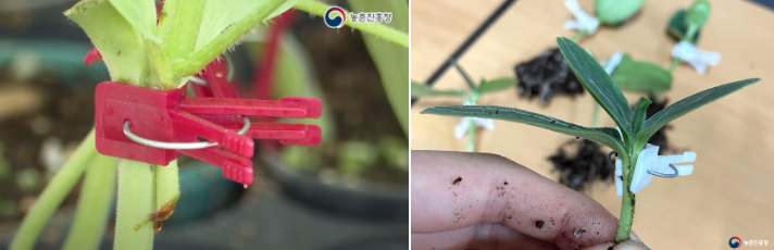3. 대목과 접수의 자른 면을 잘 맞대어 접목용 집게로 고정해 줍니다.