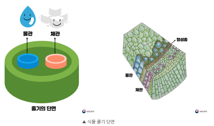 식물 줄기 속으로 들어가 보면 가운데 형성층을 기준으로 아쪽에는 물이 이동하는 길인 '물관'과 바깥쪽에는 양분이 이동하는 '체관'이 존재합니다.