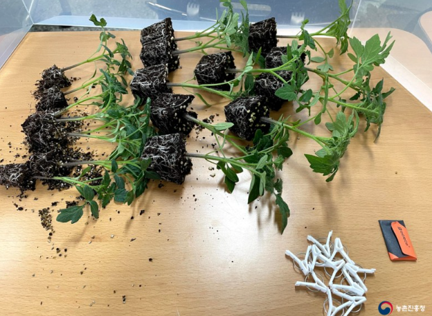 토마토 대목 10개체, 토마토 접수 10개체, 접목용 면도칼 1개, 접목용 집게 10개