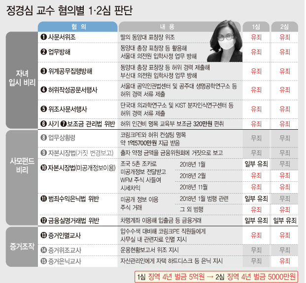정경심 교수 혐의별 1·2심 판단