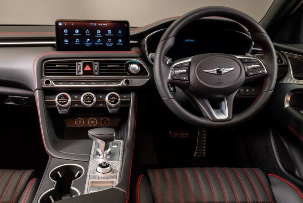 측면부터 후면까지 이어지는 측후면 일체형 유리와 가파르게 떨어지는 트렁크 라인으로 스포티함을 강조했다고 합니다. 리어램프는 트렁크를 파고드는 형태로 G70 부분변경과 차별화되었다고 합니다.