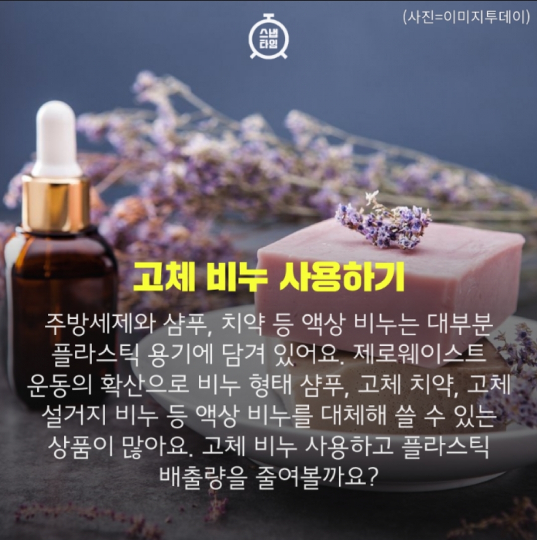 고체형 주방세제와 고체형 샴푸바가 주목받고 있는데, 액체 샴푸와는 비교되게 무방부제, 천연 성분 사용, 자연 분해가 쉽다는 것에 소비자의 소비 인식을 바꾸고 있다고 합니다.