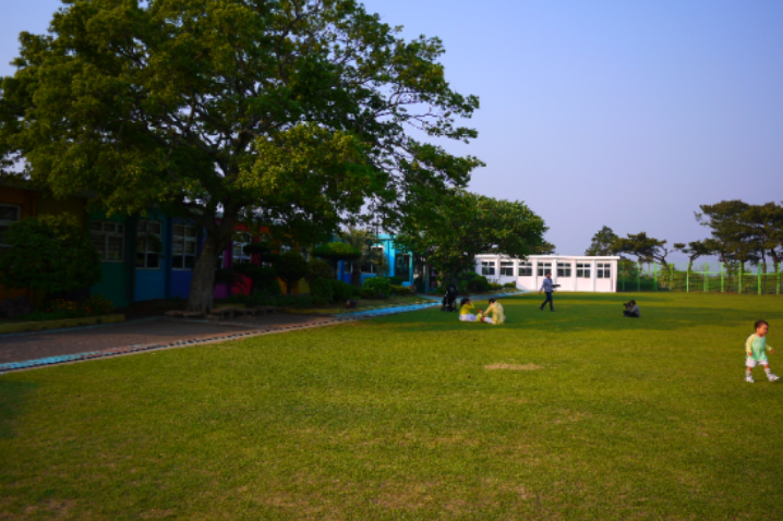 푸른 잔디가 깔린 운동장에 앉아서 한적한 교정을 느껴보시는 것은 어떨까요?