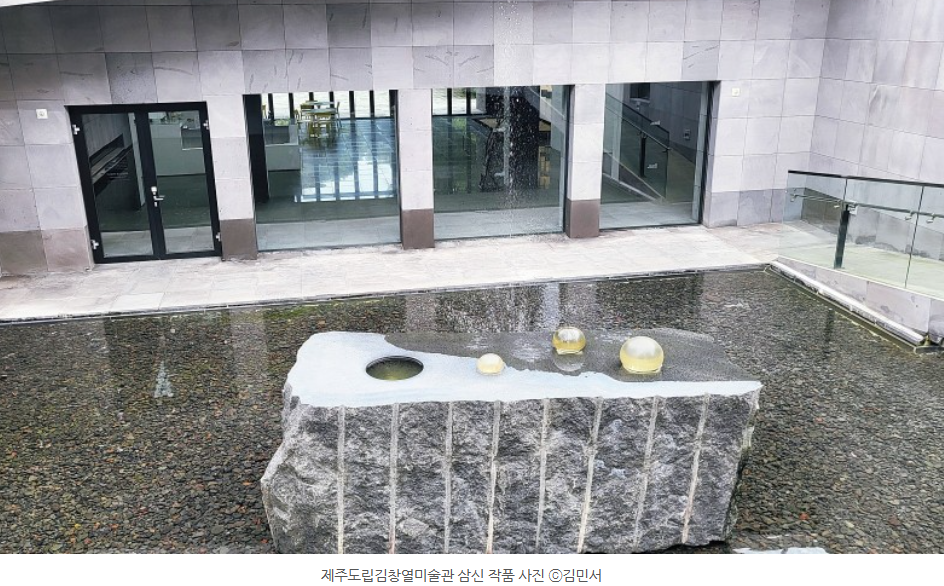 제주도립김창열미술관에서 내부전시실 관람 후 야외로 나오시면 아주 멋진 작품인 삼신을 만날 수 있습니다.
