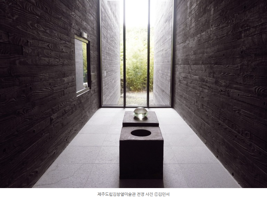 제주도립김창열미술관은 내부와 외부의 마감 재료를 동일하게 사용함으로 실내, 실외로 구분되지 않아 제주의 풍경을 차경으로 사용하였으며, 노출콘크리트기법을 사용하였고, 중정을 활용한 점도 많아 보였으며 미술관 안으로 빛을 끌어들이기 위해 간접조명을 멋스럽게 활용한 건축물이기도 합니다.