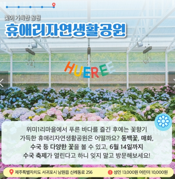 위미1리마을에서 푸른바다를 즐긴 후에는 꽃향기 가득한 휴애리자연생활공원은 어떨까요? 동백꽃, 매화, 수국 등 다양한 꽃을 볼 수 있고, 6월 14일까지 수국축제가 열린다고 하니 잊지 말고 방문하면 좋을 것 같습니다.