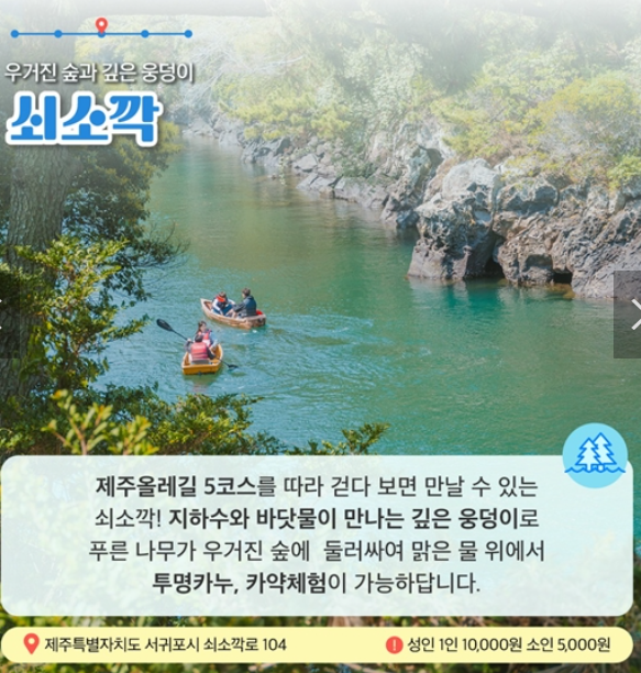 제주올레길 5코스를 따라 걷다 보면 만날 수 있는 쇠소깍! 지하수와 바닷물이 만나는 깊은 웅덩이로 푸른 나무가 우거진 숲에 둘러싸여 맑은 물 위에서 투명카누, 카약체험이 가능합니다.