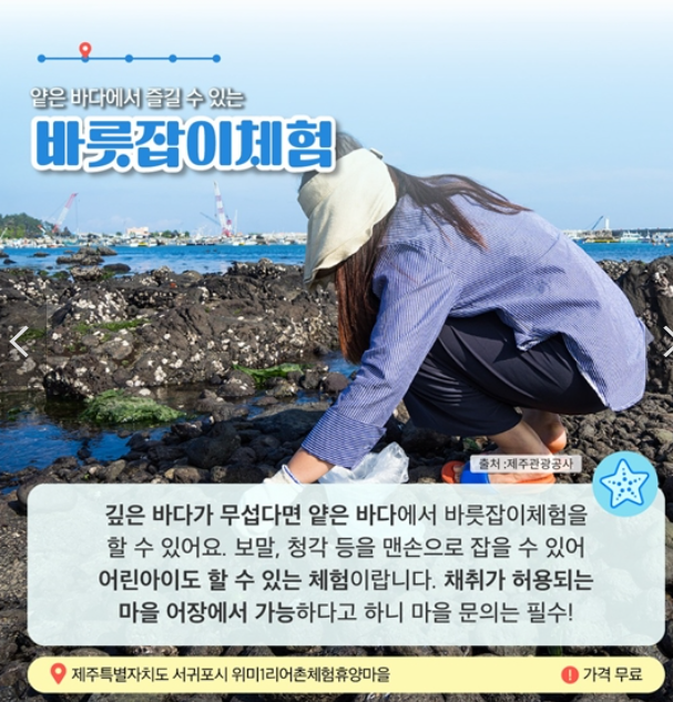 깊은 바다가 무섭다면 얕은 바다에서 바릇잡이체험을 할 수 있습니다. 보말, 청각 등을 맨손으로 잡을 수 있어 어린아이도 할 수 있는 체험입니다. 채취가 허용되는 마을어장에서 가능하다고 하니 마을 문의는 필수!