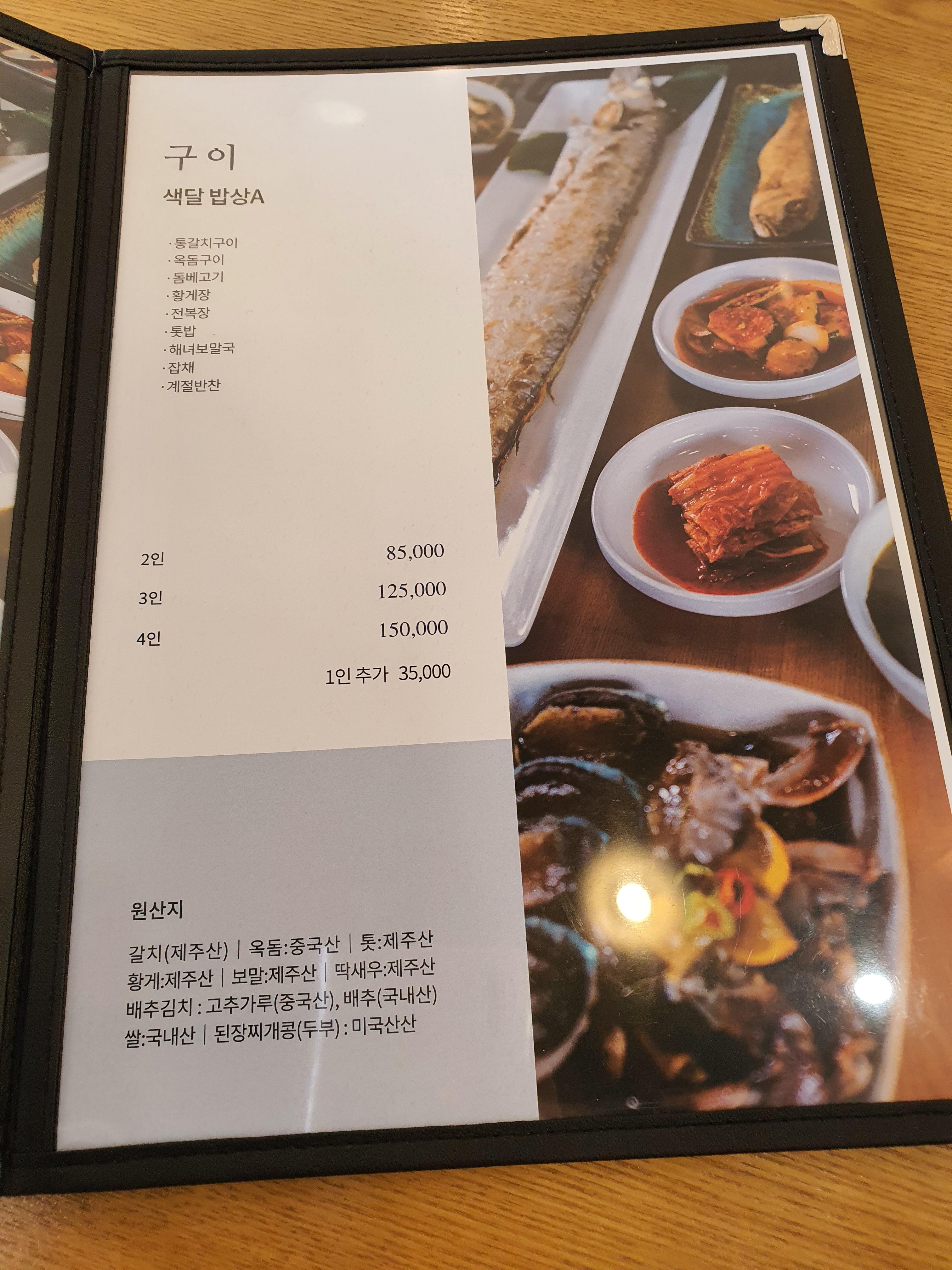 통갈치구이, 갈치조림, 옥돔구이, 돔베고기, 황게장, 전복장, 톳밥, 해녀보말국, 잡채, 계절반찬