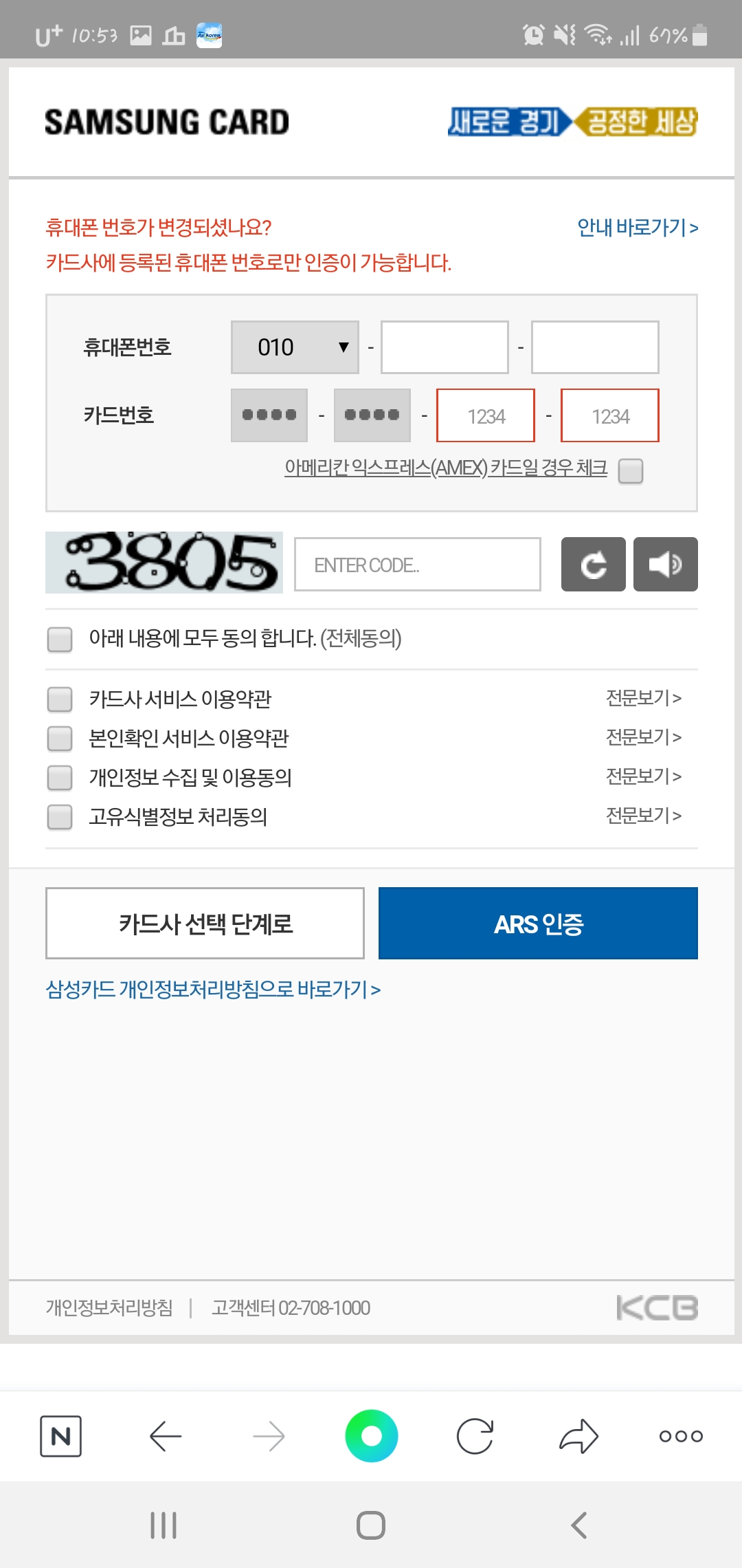 인증하기전 또하나 꼭 알아야 할 것은 법인 카드는 불가능 하며, 카드사에 등록된 휴대폰번호만 입력을 해야하며, 우리,IBK,SC제일 카드 등은 비씨 브랜드 로고가 있는 경우, 비씨카드로 인증을 해야 합니다.