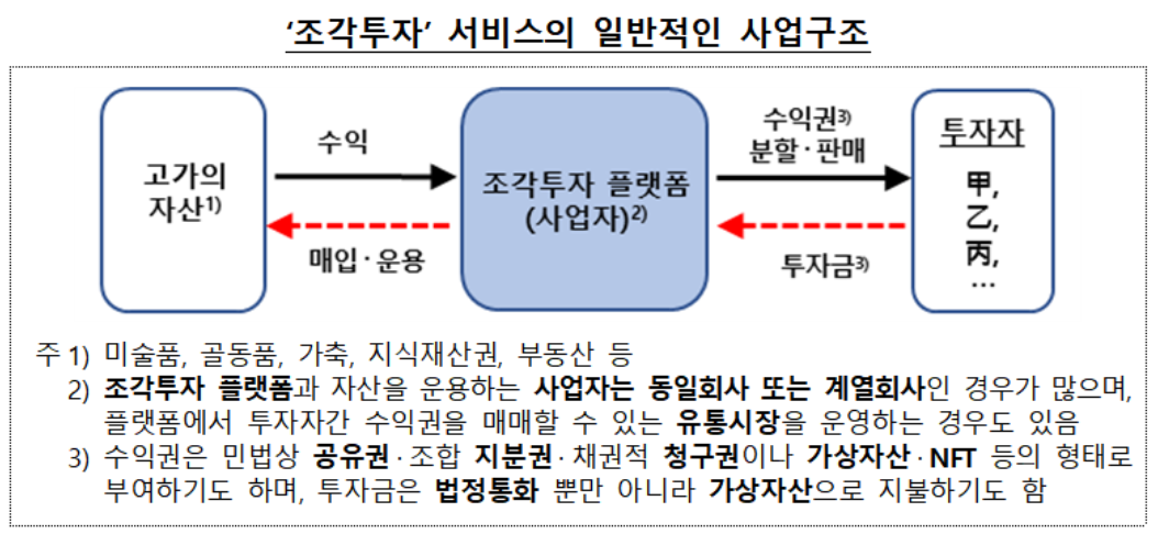 조각투자는 고가의 자산을 매입하여 보관·관리·운용하고 그 운용수익을 조각조각 분할하여 투자자에게 돌려주는 방식의 사업을 말합니다.