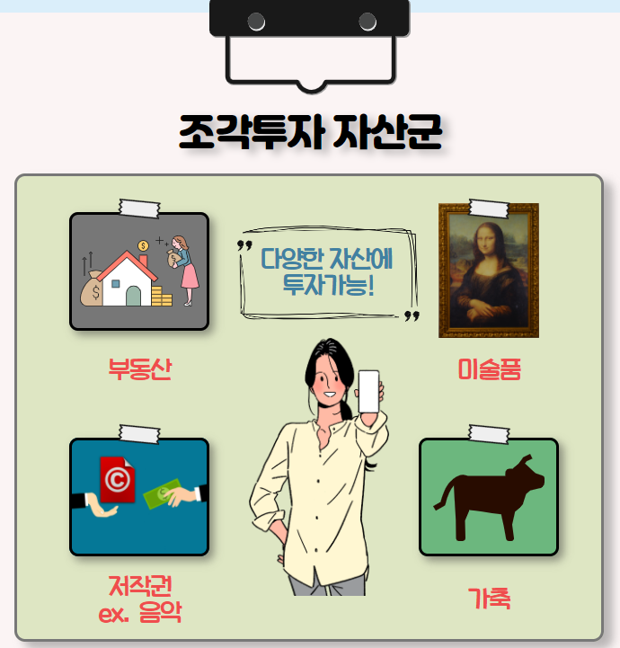 미술품, 골동품, 가축 등과 같은 동산부터 저작권 등의 지식재산권과 부동산까지 조각투자는 자산에 대한 소비자 개인의 기호와 팬덤 등을 업고, 그 영역을 확대해나가고 있다고 합니다.