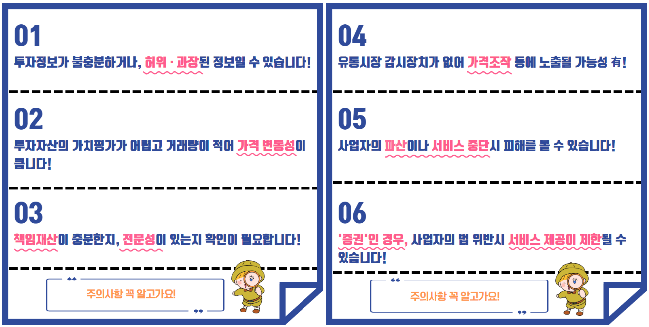 투자자는 사업자가 운용수익을 분배하겠다는 약속만 받았을 뿐, 투자대상 자산을 직접 소유하지 않거나 권리를 행사할 수 없는 경우가 많아, 사업자의 파산이나 서비스 중단 시 피해를 볼 수 있음에 유의해야 합니다.