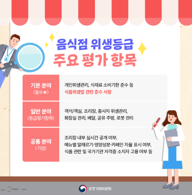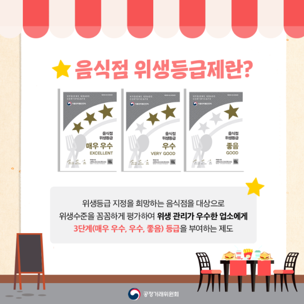2017년 5월 19일부터 시행된 음식점 위생등급제는 위생등급 지정을 희망하는 음식점을 대상으로 위생 수준을 꼼꼼히 평가하여 위생 관리가 우수한 업소에게 3단계 등급(매우 우수, 우수, 좋음)을 부여함으로써 음식점의 위생 수준을 향상하며, 식중독 예방뿐만 아니라 소비자의 선택을 보장하는 제도입니다.