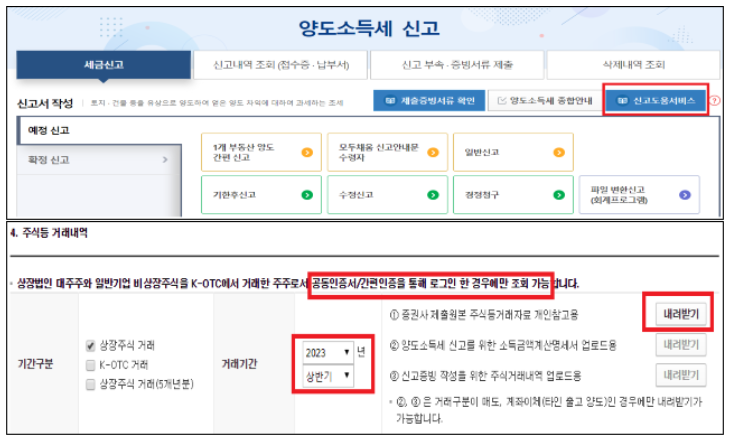 홈택스 로그인→신고/납부→양도소득세→신고도움서비스→(하단) 4.주식등 거래내역