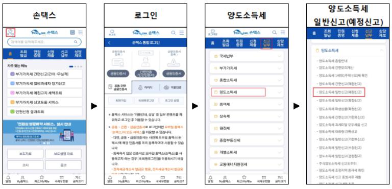 손택스 로그인→신고납부→양도소득세→양도소득세 일반신고(예정신고)