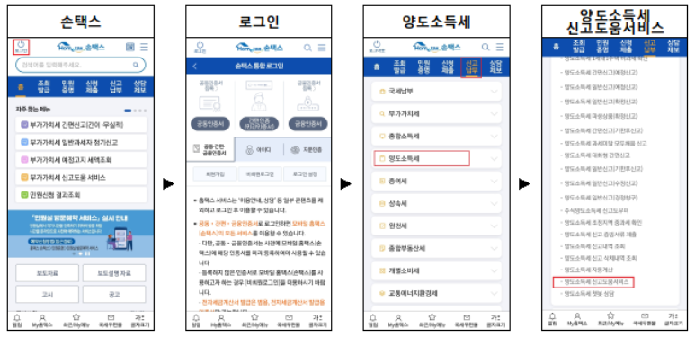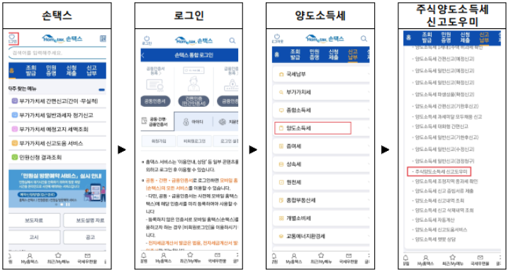손택스 로그인→신고/납부→양도소득세→주식양도소득세 신고도우미