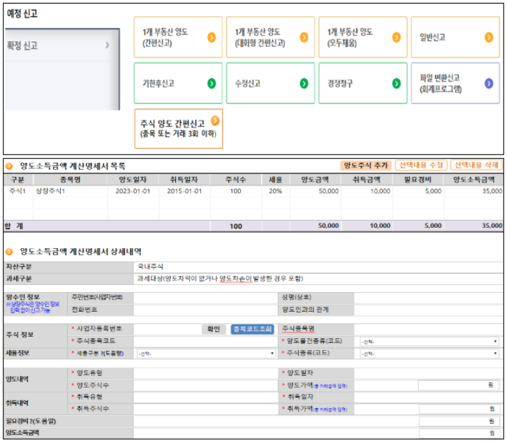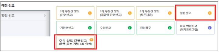 홈택스 로그인→신고납부→양도소득세→예정신고→일반신고 또는 주식 양도 간편신고