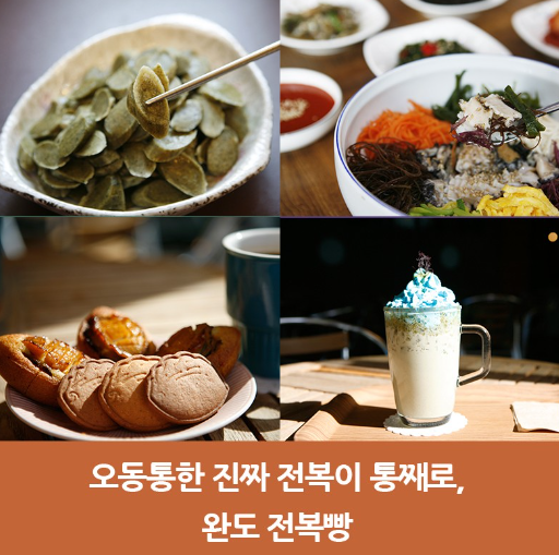 전남 완도의 으뜸 해산물이 전복입니다. 완도에서 최근 주목을 끄는 주전부리는 전복빵입니다. 지난해 초 출시되어 '빵지순레' 남도 코스에도 이름을 올렸습니다. 전복빵에는 전복 하나가 통째로 들어가는데 그 속을 가르면 오동통한 전복 속살이 얼굴을 드러냅니다. 또한 커피와 곁들여 먹어도 궁합이 매우 좋습니다.