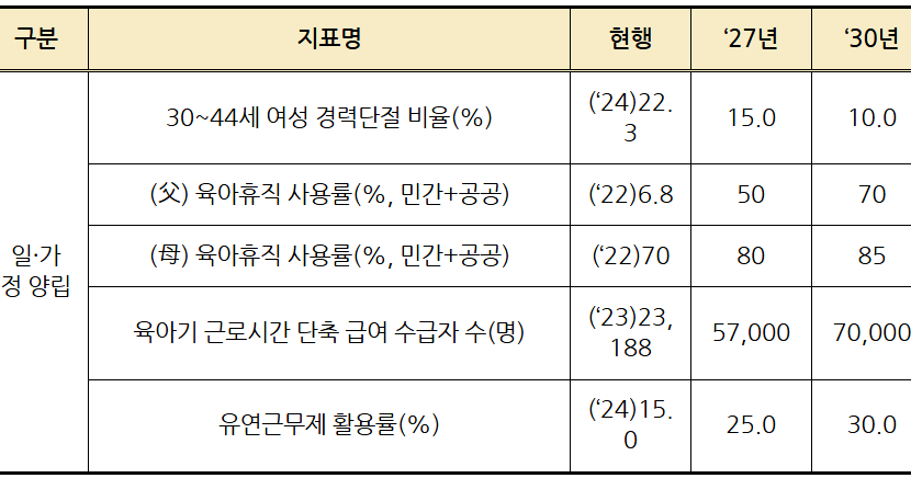 1. 일·가정 양립 분야의 경우 대책을 통해 발표한 모성보호제도, 일·가정 양립 제도가 현장에 안착되었는데, 맞돌봄 문화 및 일·육아 병행 환경은 조성되었는지 여부를 30~44세 여성 경력단절 비율, 남녀 육아휴직 사용률 등의 지표를 통해 점검할 예정이라고 합니다.