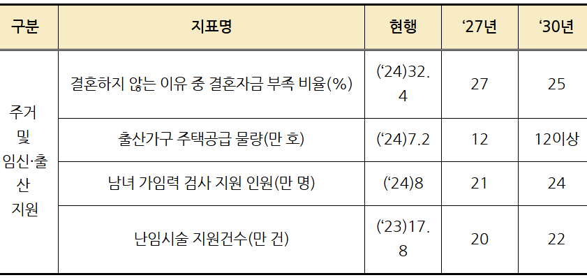 3. 주거 및 임신·출산 분야는 청년 및 부부들이 비용 걱정 없이 결혼·출산을 할 수 있는 여건이 조성되었는지 여부를 결혼자금 부족으로 결혼하지 않는 비율, 출산 가구 주택공급 물량, 가임력 검사 지원 인원 및 난임 시술 지원 건수 등 지표로 점검할 예정이라고 합니다.