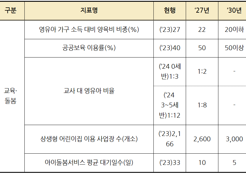 2. 교육·돌봄 분야에 대해서는 영유아부터 초등까지 누구나 양질의 서비스를 받고 있는지, 공공 교육·돌봄 기능이 제대로 작동하고 있는지 등을 영유아 가구소득 대비 양육비 비중, 공공보육 이용률, 돌봄서비스 평균 대기일 등 지표를 통해 관리할 계획이라고 합니다.