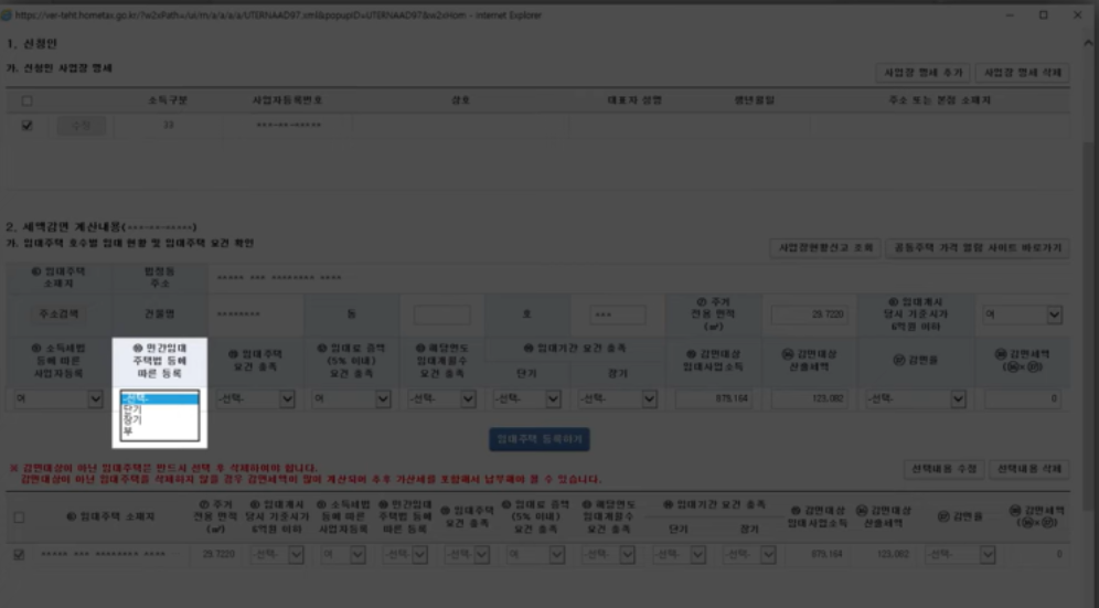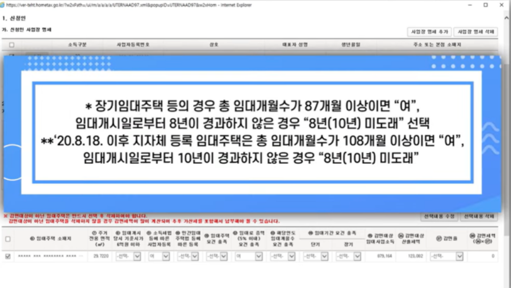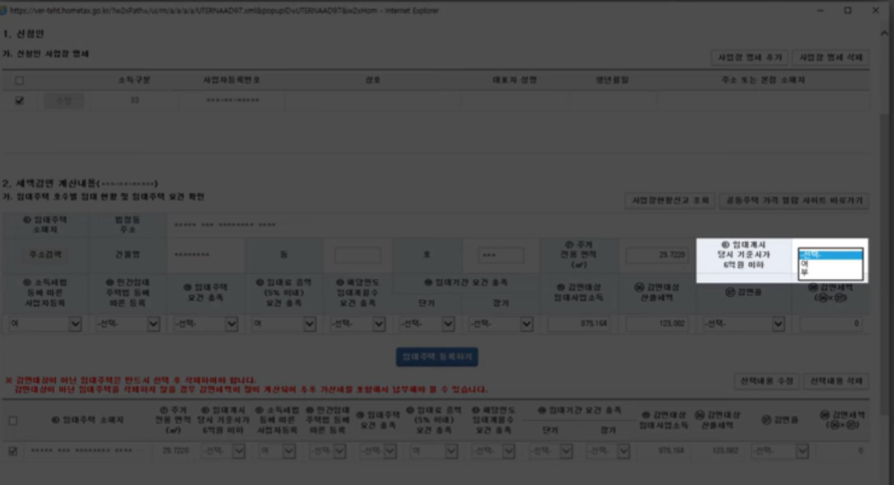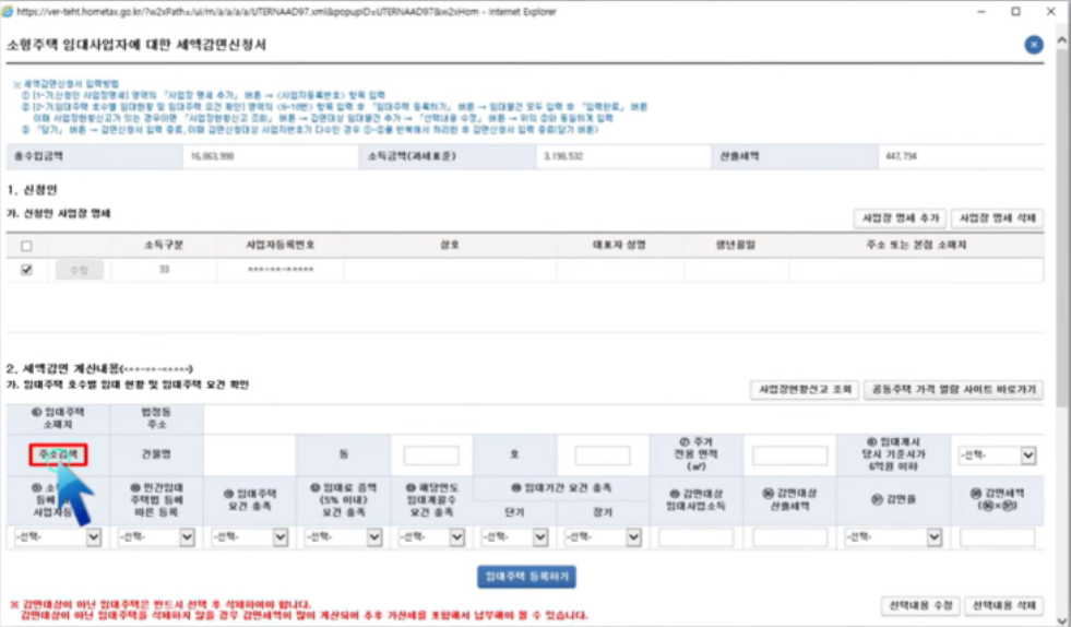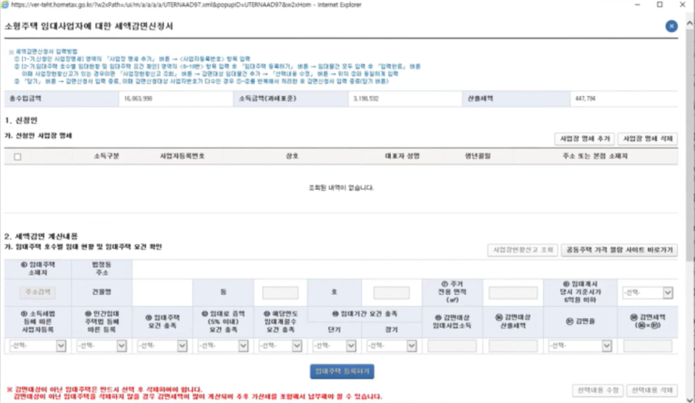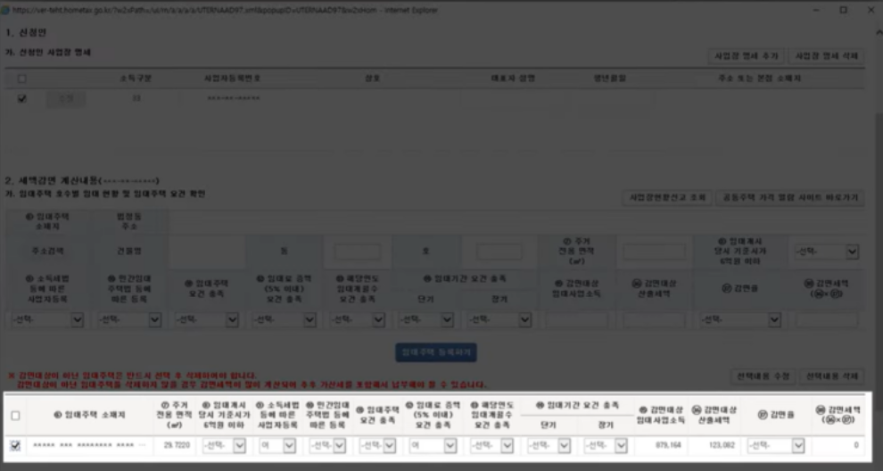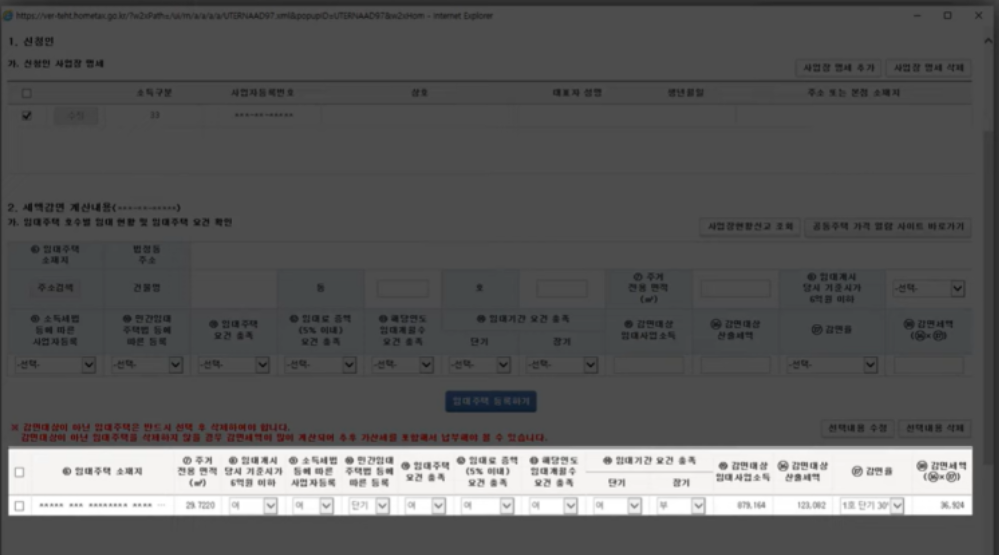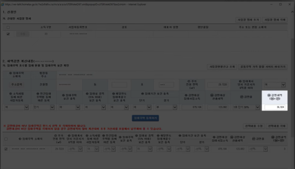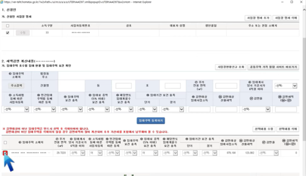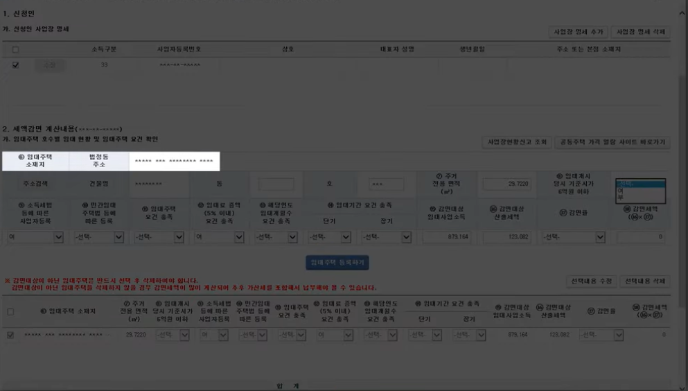 6. 화면 하단에 감면신청 대상 임대주택이 반영된 것 확인하기